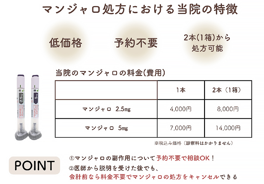 既に他のクリニックでマンジャロを処方されていても、値段が安いという理由で当院にて継続処方してほしいという方も多くいらっしゃっています。ご遠慮なくお越しください。