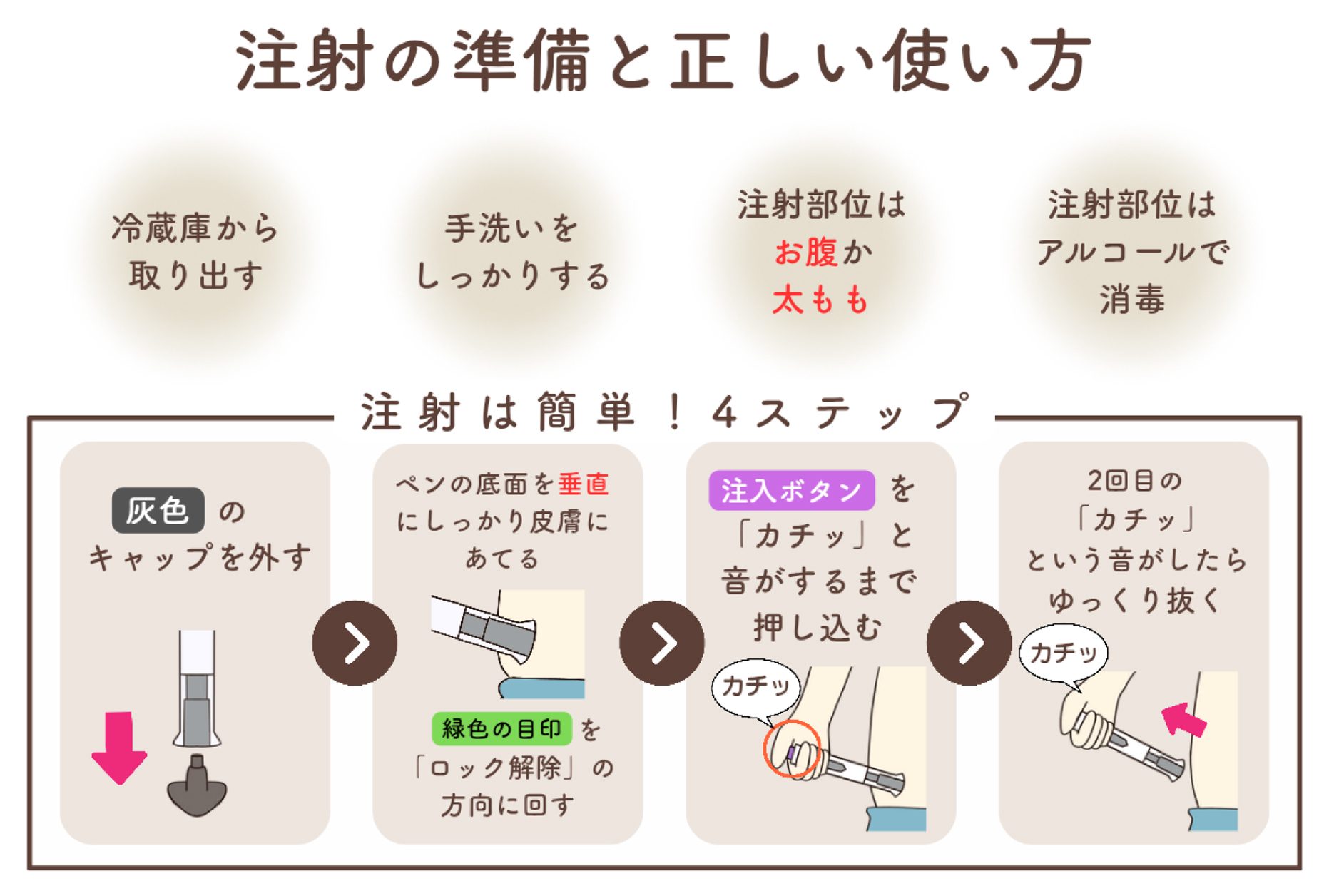 部位のローテーション: 同じ場所に繰り返し注射すると皮膚が硬くなる可能性があるため、毎回位置をずらして注射しましょう。おへそから指2本分(5cm)以上離れた場所を選ぶのが一般的です。