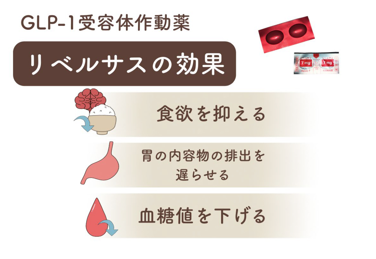 リベルサスは、もともと体内に存在するホルモンであるGLP-1(ジーエルピーワン)と同じような作用をするGLP-1受容体作動薬で、主に以下の効果により痩せる効果が期待されます。