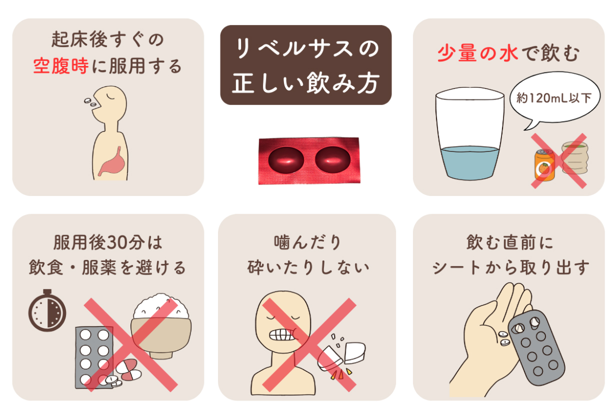 ① 空腹時に服用する: 1日の最初の食事や飲み物の前に、起床後すぐの空腹時に服用することが推奨されています。胃に食べ物や飲み物が残っていると、有効成分の吸収が妨げられてしまうためです。